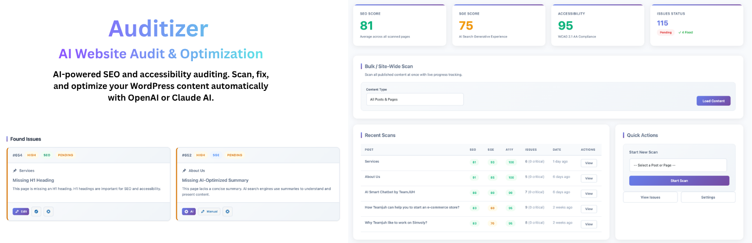 Auditizer gives you professional-grade SEO and accessibility auditing powered by artificial intelligence. Scan your entire WordPress site, identify critical issues, and apply AI-generated fixes automatically β all with full backup and one-click rollback protection.