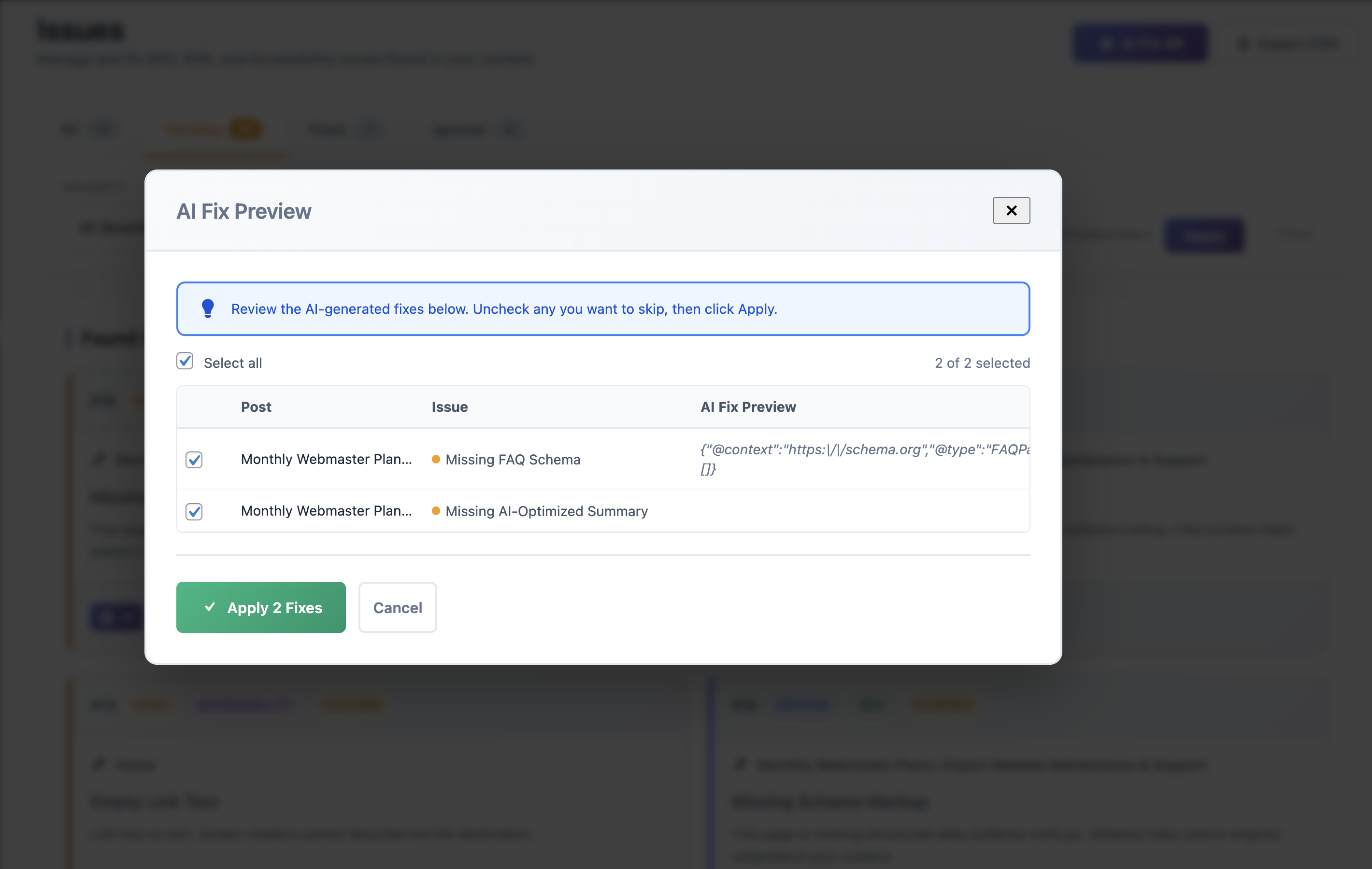 - AI-Powered Fixes β Generate intelligent fix suggestions using OpenAI GPT-4 or Anthropic Claude