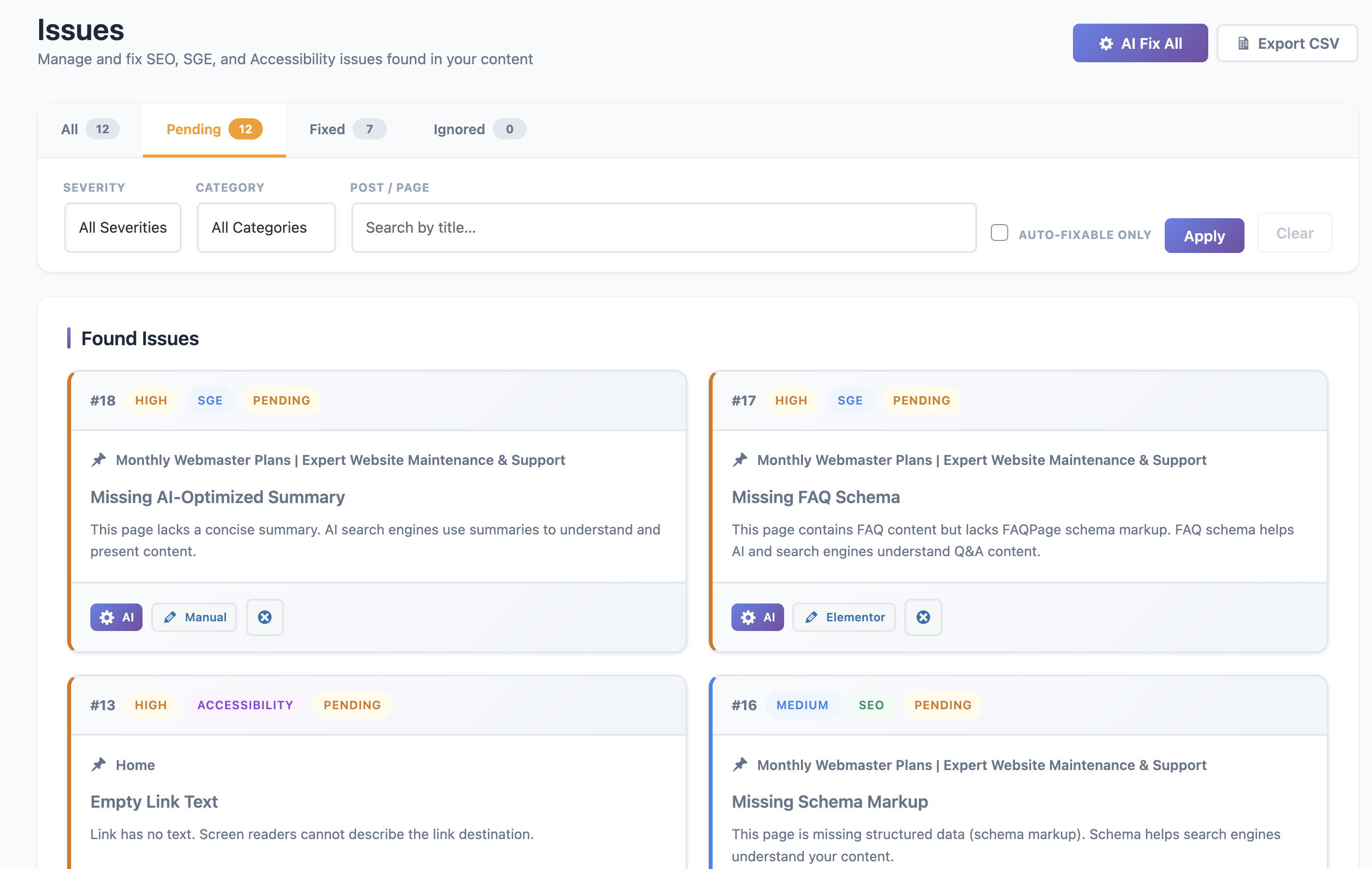 - Advanced Filtering β Filter by status, severity, category, and auto-fixable issues